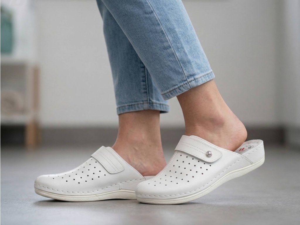 Tyto dámské zdravotní pantofle v jednoduché bílé barvě spojují pohodlí a styl. Zdobí je minimalistické dekorativní vzory, které se snadno kombinují s různými outfity a hodí se pro každodenní nošení. Povrch zajišťuje dobrou prodyšnost a módní vzhled. Nastavitelný pásek s přezkou umožňuje snadné přizpůsobení boty vašemu chodidlu. Pohodlná a anatomicky tvarovaná stélka zajišťuje správnou oporu chodidla, zatímco měkká podrážka poskytuje stabilitu při chůzi. Skvělá volba pro každodenní nošení a příjemný pocit po celý den.