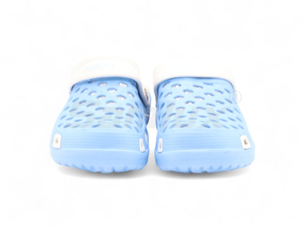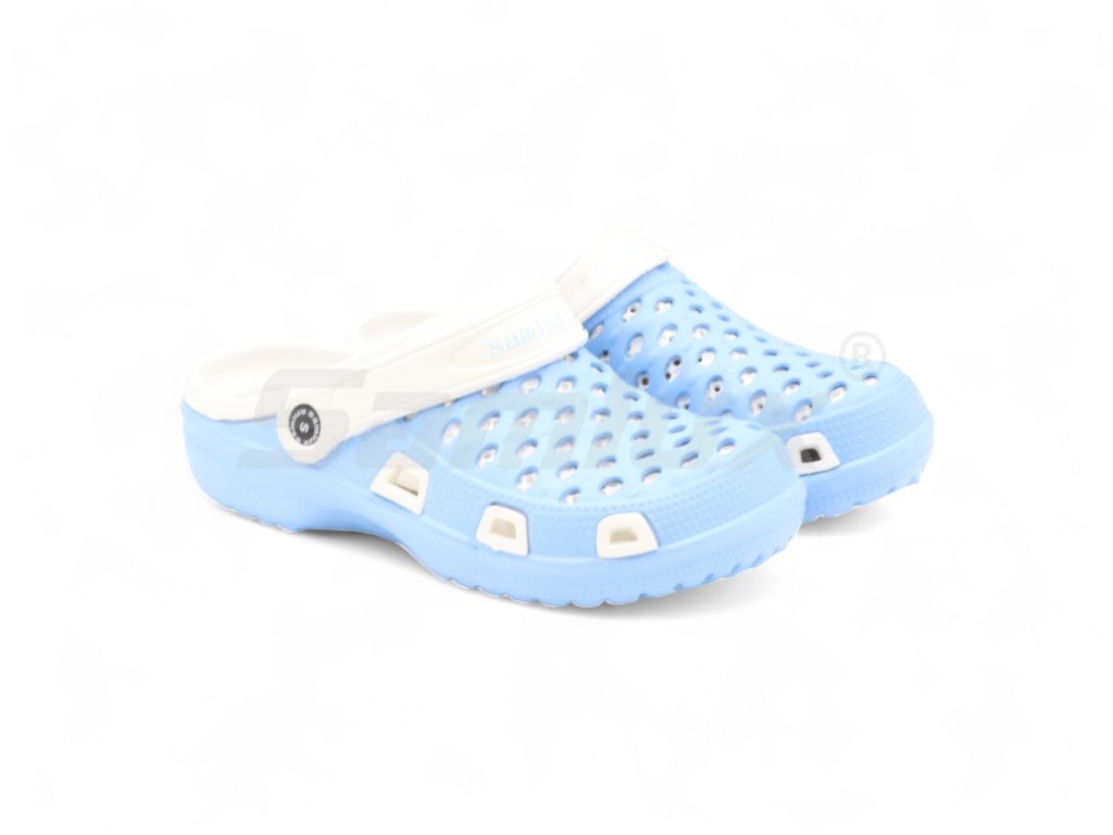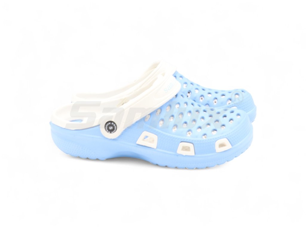Pohodlné a stylové dámské clogy. Horní část je zdobena dekorativní perforací, která zajišťuje lepší větrání nohou během horkých dnů. Clogy jsou vybaveny páskem přes patu pro bezpečné uchycení na noze.