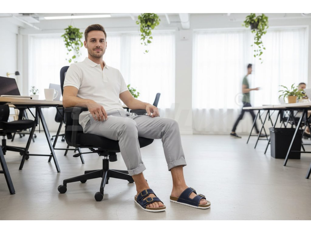 Pohodlné pánské pantofle z pravé kůže, ideální pro každodenní nošení doma, v práci nebo venku. Anatomicky tvarovaná stélka tlumí nárazy, podporuje klenbu chodidla a napomáhá správnému držení páteře. Dva nastavitelné kožené pásky s kovovými přezkami zajišťují perfektní padnutí, zatímco EVA podešev poskytuje jistotu na každém povrchu.
